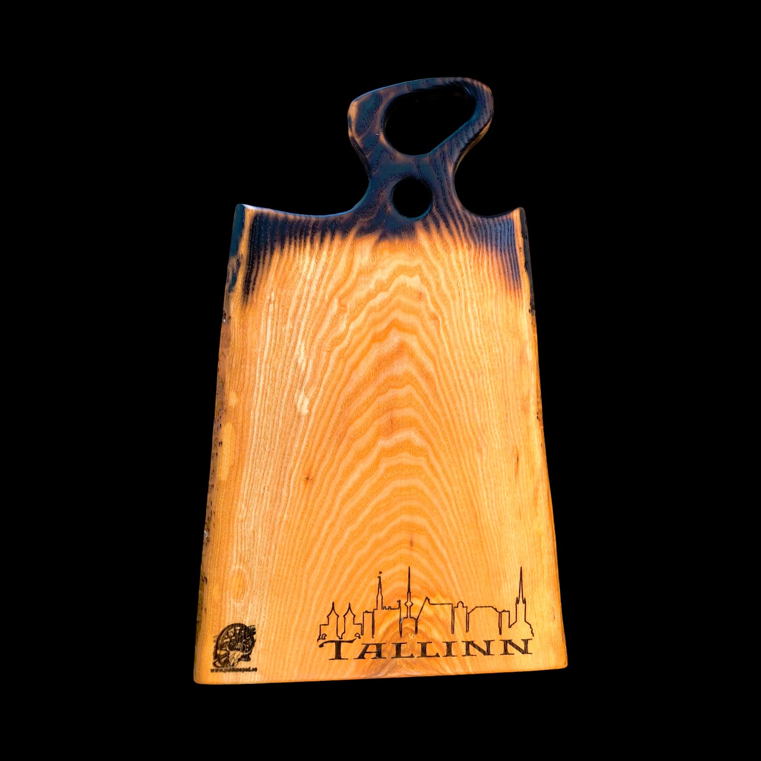 Suur põletatud puidust lõikelaud oma disainiga.