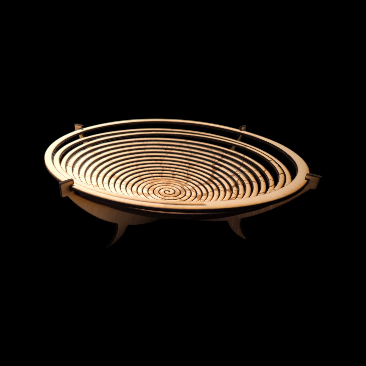 Lahe vineerist lõigatud spiraal disainiga puuviljakauss, mis lisab sinu kodule isikupära.